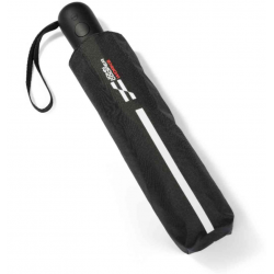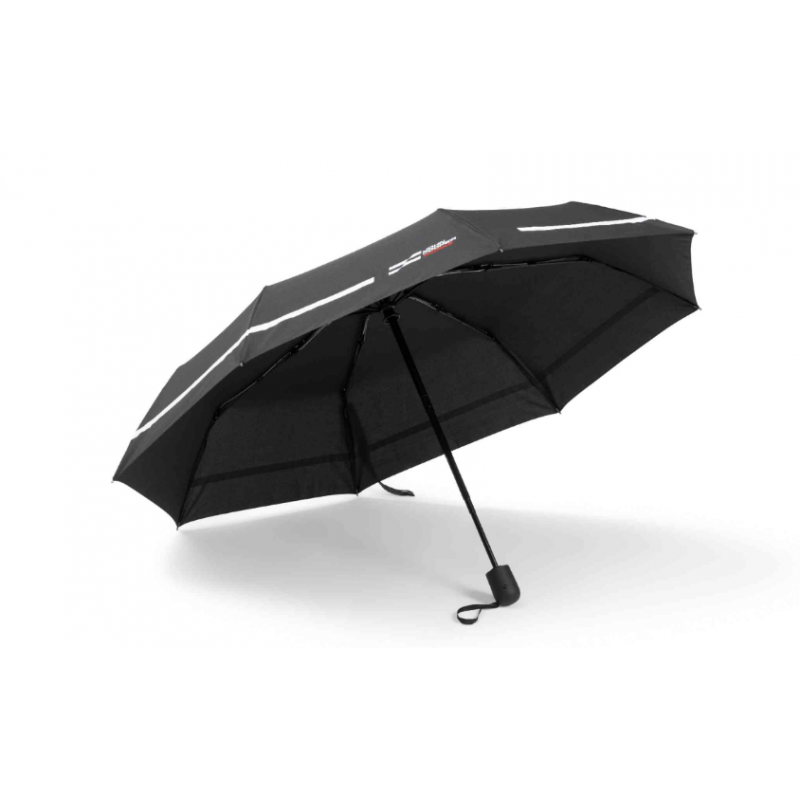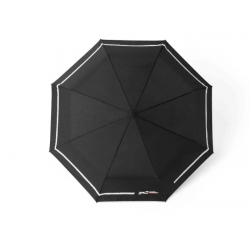 Paraguas plegable con logo JCW reflectante y estampado de rayas.