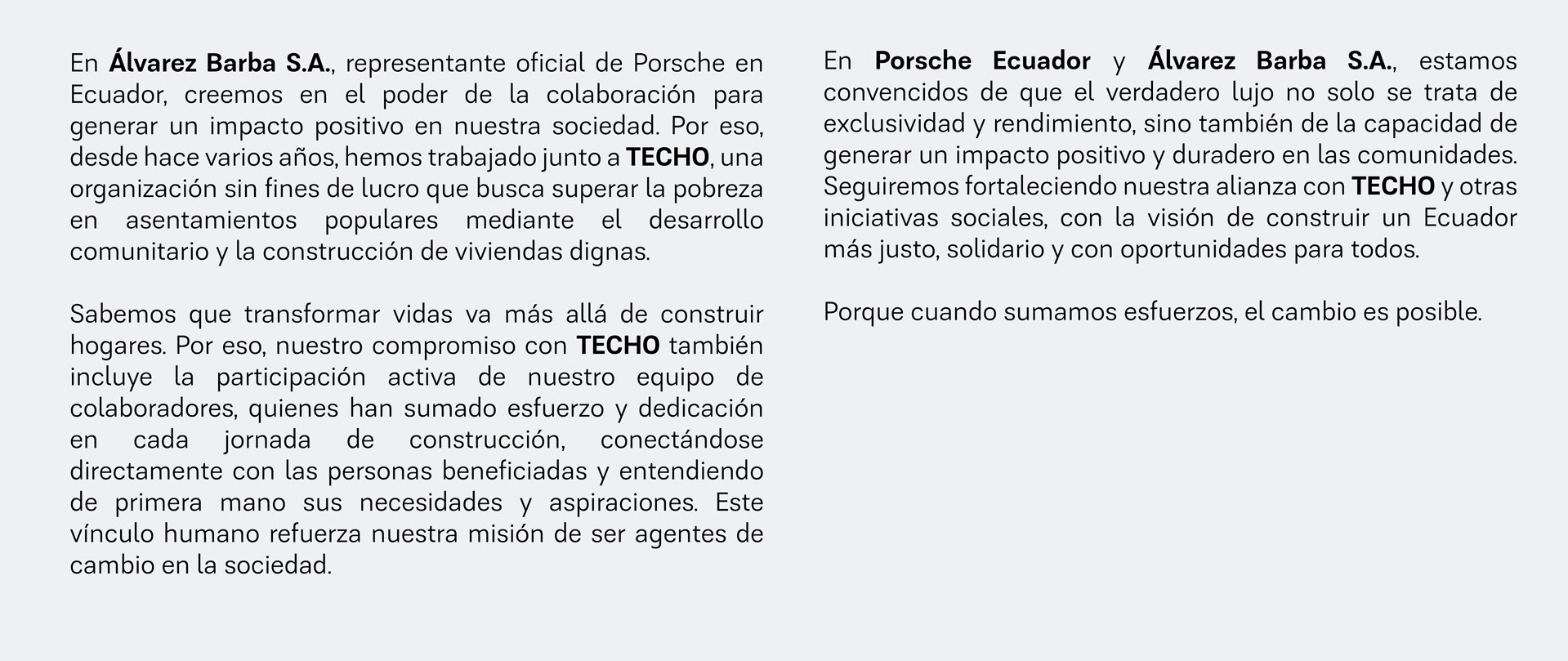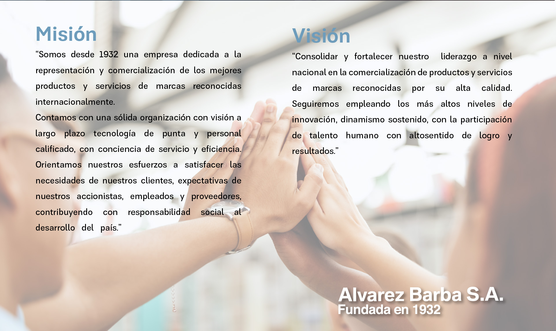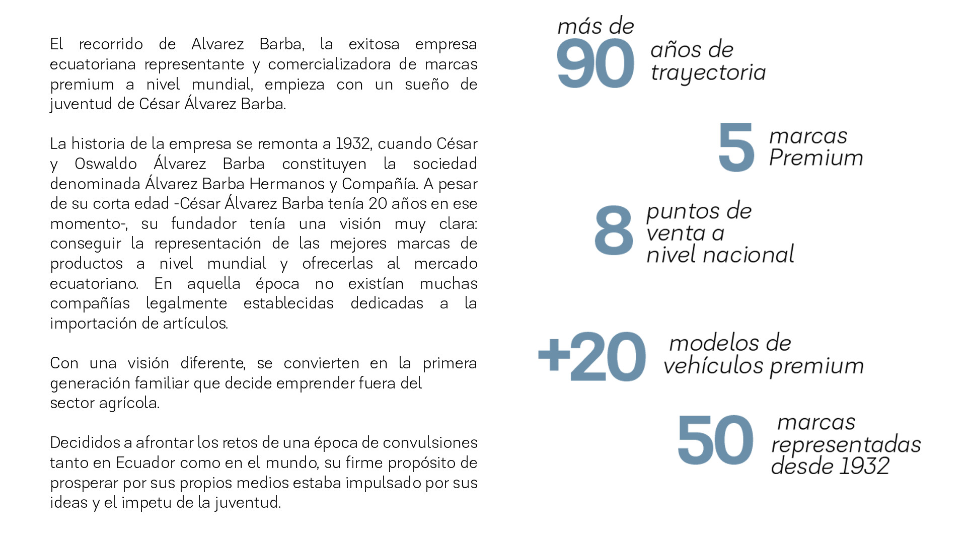 Los hermanos Oswaldo y César Álvarez Barba fundan la empresa que lleva sus apellidos. El primer local se establece en Quito. El local se traslada a la calle Venezuela 563. Se comercializan pinturas, máquinas de escribir Royal, esferográficos Parker, llantas Mohawk, entre otros. Luego de un acuerdo familiar, César Álvarez Barba adquiere el 100% de las acciones de la compañía. La compañía obtiene la representación de la famosa marca francesa Christian Dior. Álvarez Barba obtiene la representación de BMW, de modo que se convierte en el primer concesionario importador de la firma alemana en Ecuador y en América. César Álvarez Barba es nombrado Embajador del Ecuador en Francia. César Álvarez Villota asume la dirección de la compañía, en reemplazo de Genaro Mora, quien había desempeñado temporalmente la gerencia ante la salida de César Álvarez Barba en 1967. El BMW 2002 permite que la marca se posicione en el segmento premium. La gestión empresarial de Álvarez Barba pasa a manos de Pedro Álvarez Villota, su actual presidente. Por primera vez, Álvarez Barba supera los 115 millones de sucres en ventas. Álvarez Barba supera los 1.000 millones de sucres en ventas. La compañía es nombrada importadora oficial de la marca Porsche. BMW celebra su aniversario número 40 en Ecuador. En ese momento cuenta con una participación del 1,2% del mercado total. BMW es líder del segmento premium con un 38% de participación. Se obtiene la certificación Quality Management Auto House para BMW. MINI, la marca de diseño innovador y compacto, entra al mercado ecuatoriano de la mano de Álvarez Barba. Álvarez Barba inicia su apoyo a la Fundación TECHO. BMW Serie 3 es el modelo más vendido en el segmento premium. BMW Group Latinoamérica saluda a Álvarez Barba S.A., en Ecuador, por sus 90 años de operaciones, entre ellos, por más de 60 como su importador oficial. Mini cumple 10 años en el mercado ecuatoriano de la mano de Álvarez Barba. BMW inauguró un nuevo Showroom en Cumbayá. |